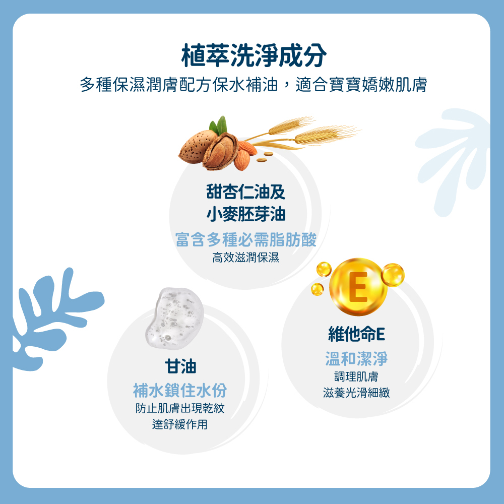 ●甜杏仁油、小麥胚芽油、甘油補水更滋潤。